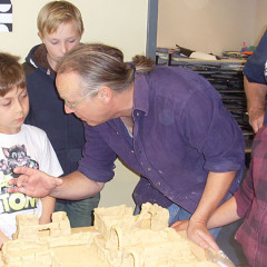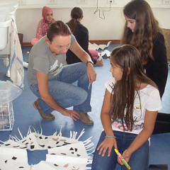 Die Gruppe mit Frau Anosike entwirft und gestaltet Kleidung und Kostüme aus festem Papier, die Gruppe mit Herrn Sander-Manzek baut ein Stadtmodell aus Ton.